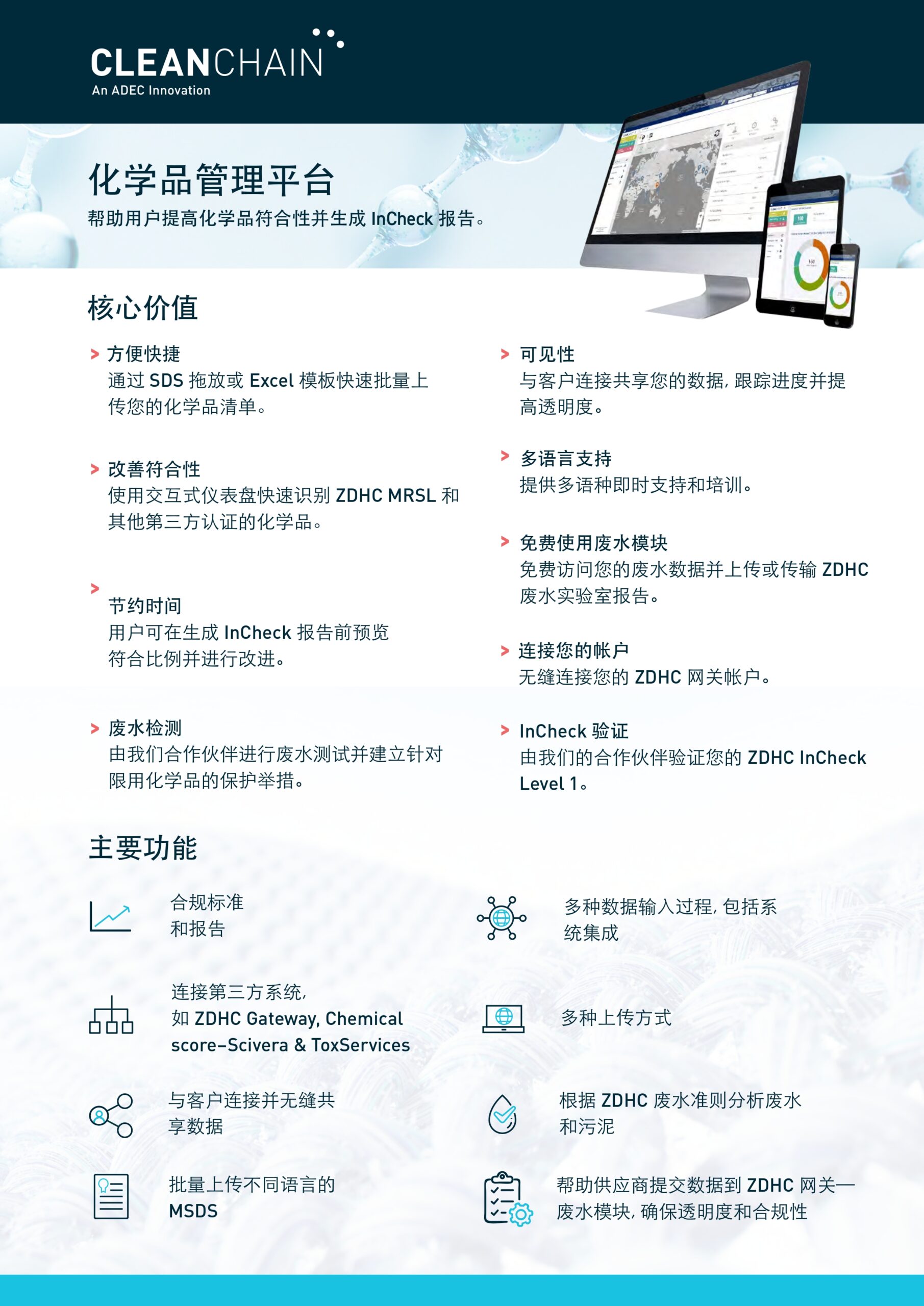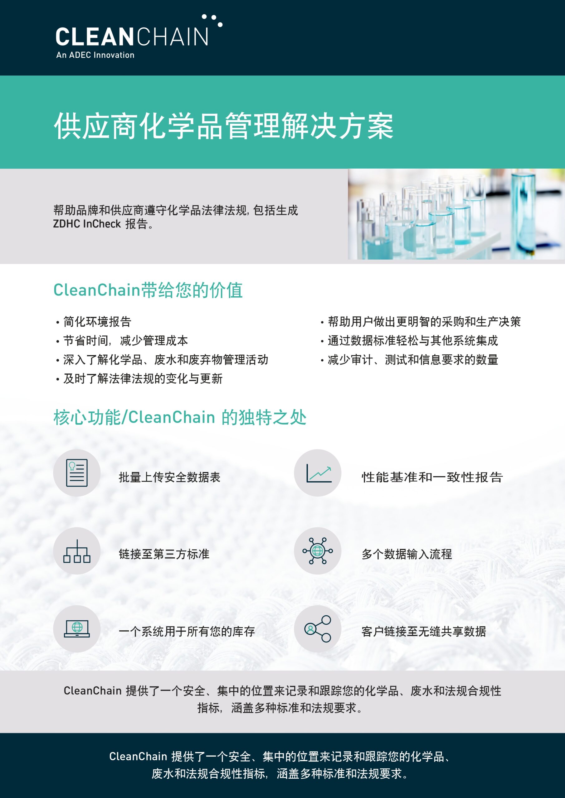 CleanChain是ZDHC官方认可的解决方案服务提供商,通过规范化学品数据管理与认证报告服务,助力纺织供应商满足ZDHC MRSL相关要求。
